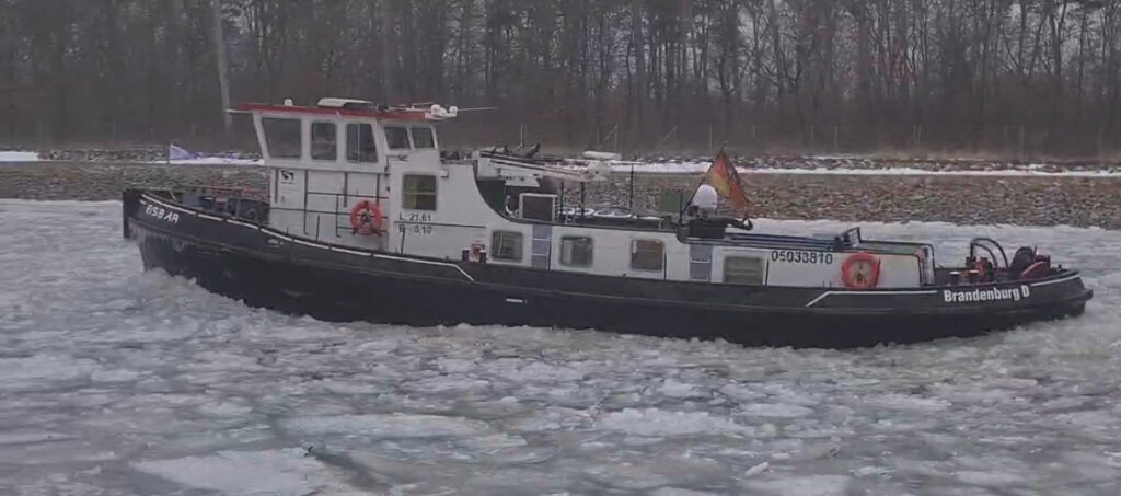 Der Eisbrecher „Eisbär“ war in zügiger Fahrt dabei die Schollen auf dem breiten Kanal am